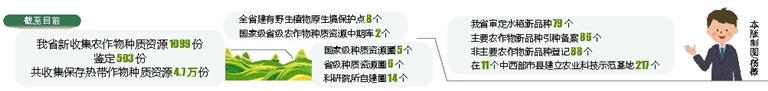 截至目前,我省新收集农作物种质资源1099份,鉴定503份;共收集保存热带作物种质资源4.7万份,保存量处世界领先水平,其中槟榔、荔枝、龙眼和香辛饮料保存量居世界第一位。