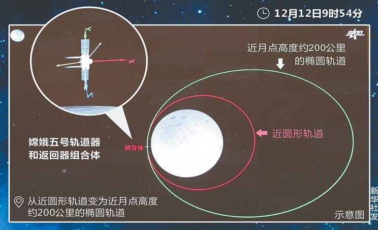 新华社北京12月12日电 (记者胡喆)记者从国家航天局获悉,12月12日9时54分,嫦娥五号轨道器和返回器组合体经历了约6天的环月等待,实施了第一次月地转移入射,从近圆形轨道变为近月点高度约200公里的椭圆轨道。