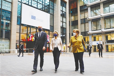 欧盟27国领导人11日在布鲁塞尔举行的峰会上就更高的减排目标达成一致,决定到2030年时欧盟温室气体排放要比1990年减少至少55%,到2050年实现“碳中和”。图为欧洲理事会主席米歇尔、欧盟委员会主席冯德莱恩和德国总理默克尔(从左至右)在欧盟冬季峰会结束后走出会场。 新华社发