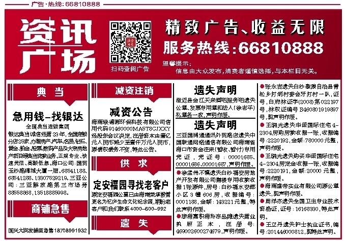 银达典当诚信经营23年,全国连锁分店25家,办理房产、汽车、名表、钻石、黄金、铂金、股票、数码产品及大宗房地产项目等典当贷款业务。正规专业、快速灵活、高额低息。海口公司:国贸玉沙路椰城大厦一层。68541188、68541288、13307529219。三亚公司:三亚解放路第三市场旁 88558868,13518885998。