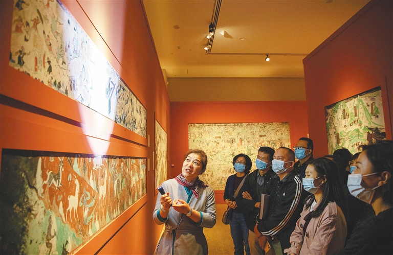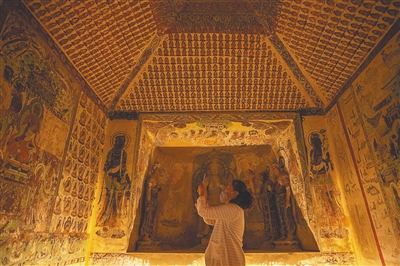 “敦煌莫高窟艺术,是在传统汉晋艺术基础上,吸收融合外来艺术的营养,形成具有中国风格的佛教艺术,是融建筑、雕塑、壁画三者于一体的立体艺术,生动地展现了中古时期中国千余年间的社会生活画卷,也是世界上现存规模最大、历史延续最悠久、保存较完整、内容最丰富、艺术最精美的佛教艺术遗存,代表了公元4世纪至14世纪中国佛教艺术的高度成就。”敦煌研究院讲解员史玉燕说。