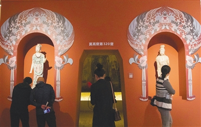 两旁有菩萨立像守护的,是莫高窟第320窟的复制洞窟,这是本次艺术展的一大亮点。置身在方形覆斗顶形制的洞窟中,给人身临其境般的观展享受——头顶的主室窟顶藻井画云头牡丹井心,四周以方胜纹、团花等作边饰,结构严密,赋色精细,四披画千佛;正前方的壁龛内塑像有浮塑背光、一弟子、二菩萨,丰肌秀骨,形体健美,斜披天衣,罗裙贴体,塑工精细;再看龛顶的弥勒说法图,二弟子、四菩萨、二天王依次而立,天王身着锁子甲、髀禈,这为说法图中仅见;龛外两侧绘制的观音,虽因变色与轮廓线脱落而露出底色形成的白线,但仍未失原来线描爽利之本色;南壁中间绘制的释迦牟尼树下说法图,前有一舞伎挥巾起舞,两旁有伎乐伴奏,气氛欢快热烈;北壁通壁绘制观无量寿经变,用了很大的篇幅描绘了西方净土世界的美妙景象……