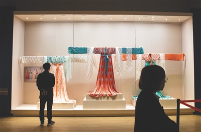 壁画旁,由都督夫人礼佛图仿制出的一组服饰,让观众感受到唐朝服饰的绮丽纷呈。而敦煌石窟跨越千年的服饰图像,也集中、全面、系统、直观地反映出中国古代服饰发展嬗变的脉络。