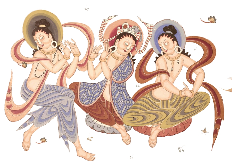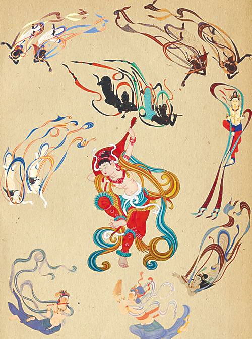 在佛教的“净土胜地”中,音乐与舞蹈是不可或缺的要素。据统计,在现存敦煌石窟中保留有舞乐题材的洞窟共有236个,其中绘有各种类型的乐队约500组,且大多伴有舞蹈场面;所出现的各种类型的乐器计有44种4500余件之多。在全世界的壁画历史中,就反映的乐舞数量之多、品类之丰富、时间跨度之长而言,敦煌壁画都是无与伦比的。