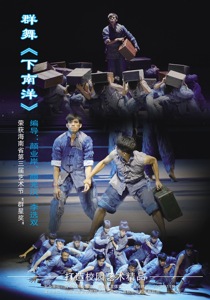 2013年习近平总书记来海南视察时,专程前往潭门港登上渔船,鼓励渔民要“造大船、闯深海、捕大鱼”。颜业岸从电视上看到这一场景后深为感动,当即决定要创作一部南海题材舞蹈。他带着学生们深入到潭门港的渔民生活中,参加潭门赶海节和祭海仪式,随即编排出舞蹈《南海潮》,生动深刻地演绎了世世代代海南渔民耕海牧渔、守护祖宗海的历史和情怀。