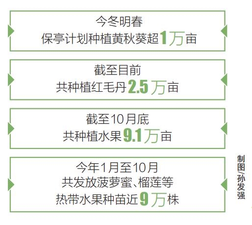 据统计,今年1月至10月,保亭各乡镇共发放菠萝蜜、榴莲、红毛丹等热带水果种苗近9万株,进一步调动了农户种植热带水果的积极性。截至10月底,保亭水果种植面积共计9.1万亩,新增种植面积4540.18亩,同比增长5.8%。