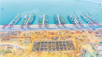 12月11日,俯瞰海口港新海滚装码头客运综合枢纽站工程项目。目前,该项目已完成集散区基础开挖、中心区地下室基坑开挖等施工。