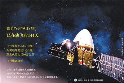 新华社北京12月15日电(记者胡喆)记者15日从国家航天局获悉,截至12月14日21时,“天问一号”探测器已在轨飞行144天,飞行里程约3.6亿公里,距离地球超过1亿公里,距离火星约1200万公里,飞行状态良好。