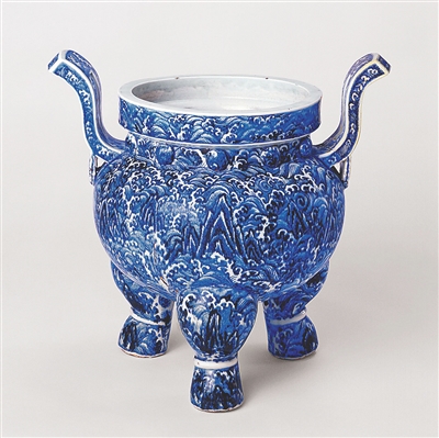 永乐青花江崖海水纹三足炉,通高60厘米,两耳间宽58.5厘米,腹径48.4厘米,口径39厘米。炉为鼎式,短颈,鼓腹,朝天耳,三兽蹄足。颈凸起鼓钉纹,炉内施白釉,外壁青花装饰海水江崖纹,海水汹涌叠起,浪花起伏相连,江崖稳稳地矗立在汹涌澎湃的海浪之中,整个器型十分雄伟。在传世与出土永乐官窑瓷器中,青花江崖海水纹十分罕见。传世品与该器型制相同者,目前发现北京故宫博物院和南京博物院各有一件。