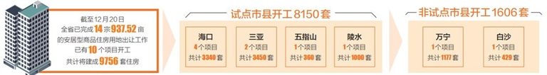 2020年,省政府工作报告把稳妥推进安居型商品住房建设列为今年重点工作任务之一,海口、三亚、儋州、五指山、定安和陵水6个市县率先启动安居型商品住房试点建设。目前,各市县正在加快项目建设进度,力争2021年底陆续有一批安居型商品住房建成供应市场。