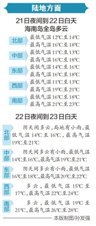 海南省气象台预计,“科罗旺”将以每小时15公里左右的速度向西偏南方向移动,强度变化不大,穿过南沙群岛西部海域后,逐渐向越南南部一带沿海靠近。受热带低压和冷空气共同影响,海南本岛陆地和近海将出现持续低温和海上大风天气。其中,预计20日夜间到21日白天,海南岛西部最低气温9℃至11℃。