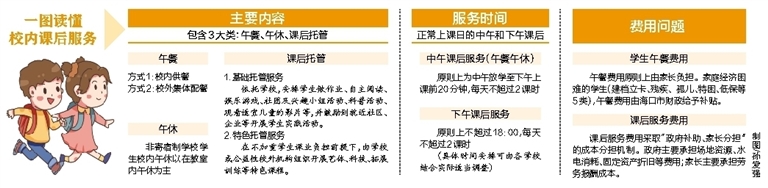 海口校内课后服务内容主要包含午餐、午休、课后托管三大类。课后服务时间主要指正常上课日的中午和下午课后,不含晚上及周末、节假日、假期等休息时间。中午课后服务(午餐午休)时间原则上为中午放学至下午上课前20分钟,每天不超过2课时。下午课后服务时间原则上不超过18:00,每天不超过2课时。具体时间安排可由各学校结合实际适当调整。
