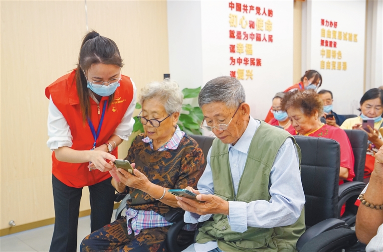 日前,在三亚市天涯区党群服务中心,数十位社区老人在志愿者的帮助下,学习使用智能手机上有关日常生活服务的APP。