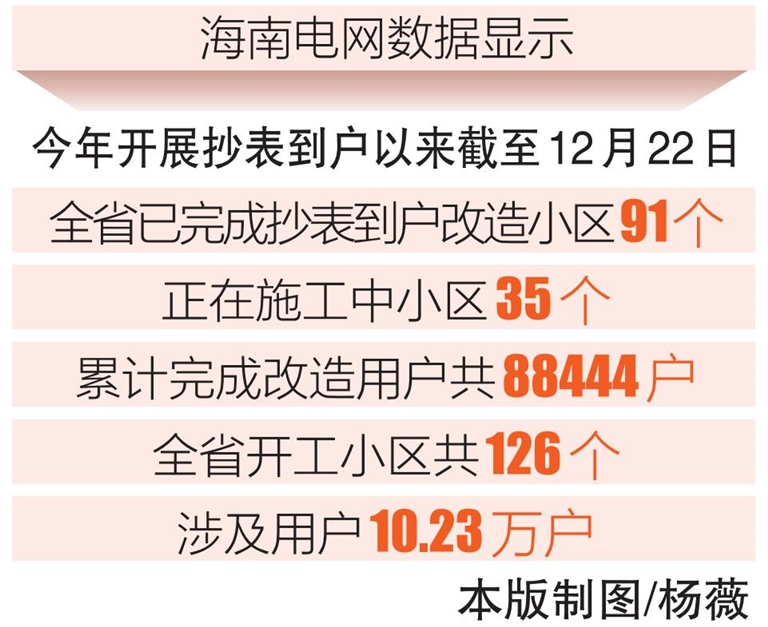 本报海口12月23日讯(记者邵长春 通讯员朱玉 杨永光 吴淑美)12月22日,在海口爱琴海小区,南方电网海南电网公司员工正对该小区公共照明区域电表进行更换,小区业主的电表已经全部更换完成,再更换完公共区域的20块电表后该小区就实现抄表到户了。
