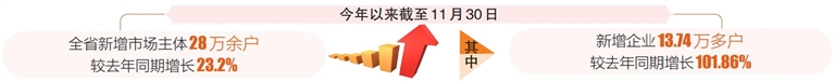 11月当月,全省新增市场主体3.21万多户,较去年同期增长8.92%;其中,新增企业1.24万多户,较去年同期增长37.25%。9月至11月,全省新增市场主体连续3个月超过3万户。