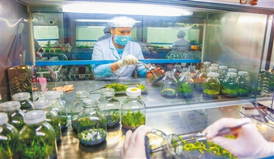 日前,在东方市东方上彩现代农业有限公司,工人正在培育花卉种苗。