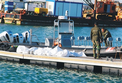 12月24日,在突尼斯斯法克斯港,海岸警卫队成员在偷渡者的尸体旁工作。