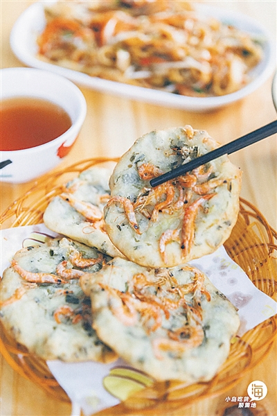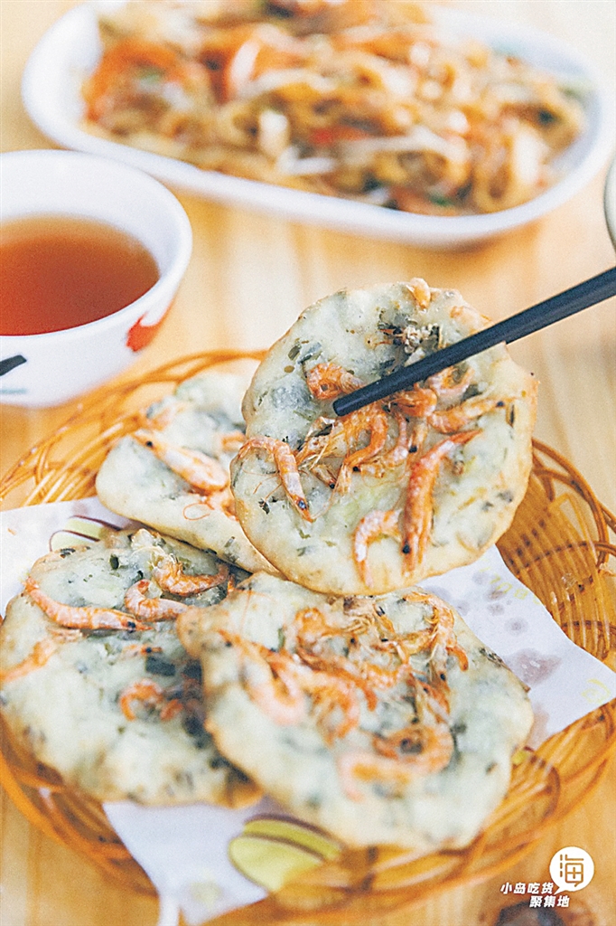 东方的虾饼也是一大特色小吃。高海峰说,和临高用韭菜搭配的做法不同,八所虾饼用的是葱花和小虾,小虾更易炸脆,可以整只吃下都不留渣,“而虾和葱结合,是大海和大地的文化糅合形成一种大自然的芳香!”他说。