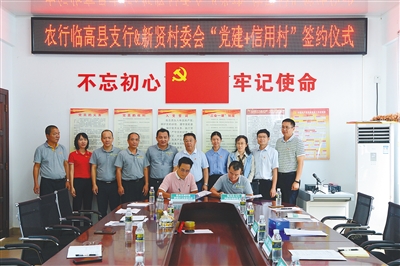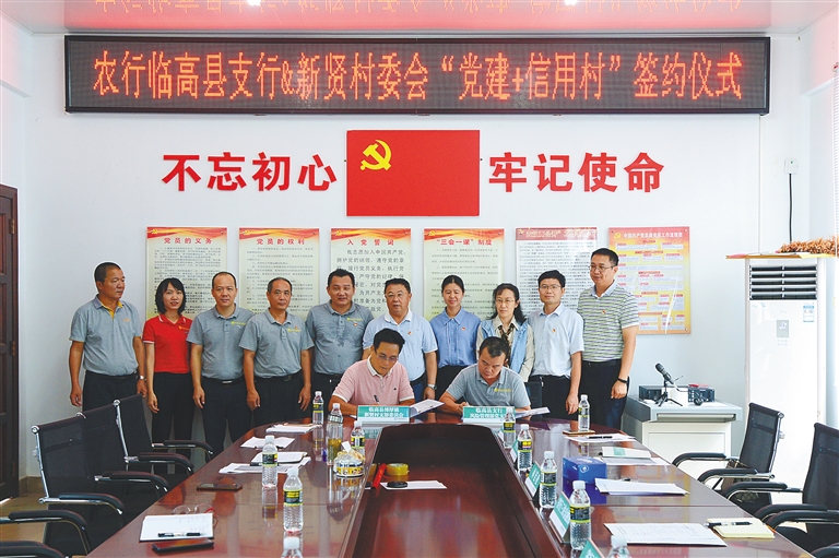 海南农行临高县支行在定点扶贫村临高县新贤村成立了脱贫攻坚临时党支部,16名扶贫党员干部全员进村入户,精准帮扶,打造了一支“永不下班”的坚强扶贫队伍。创新开展“党建+金融+扶贫”模式,“党建+金融+扶贫”工作经验被省委组织部编发简报交流。创新推出“党建+信用村”模式,以“阵地共建、经验共享、客户共管、人才共育、难题共帮”为主要内容,不断丰富结对共建内涵,注重活动成效,以党建为引领推动脱贫攻坚工作。截至2020年11月末,全行18家县域行党组织均与当地村级党组织结成共联共建单位,建立“党建+信用村”100个。