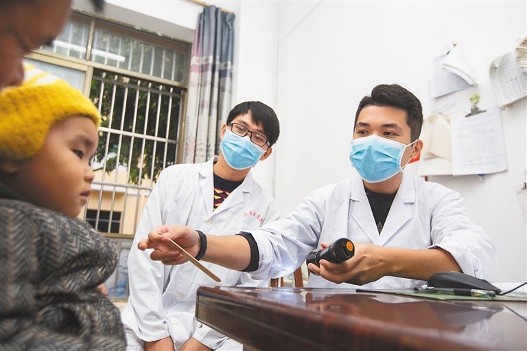 近日,在白沙黎族自治县南开乡卫生院,已在基层工作一年的全科医生邓端仕为孩子看病,刚毕业的全科医生李雄毅在一旁跟班学习,他们都是农村订单定向医学生。