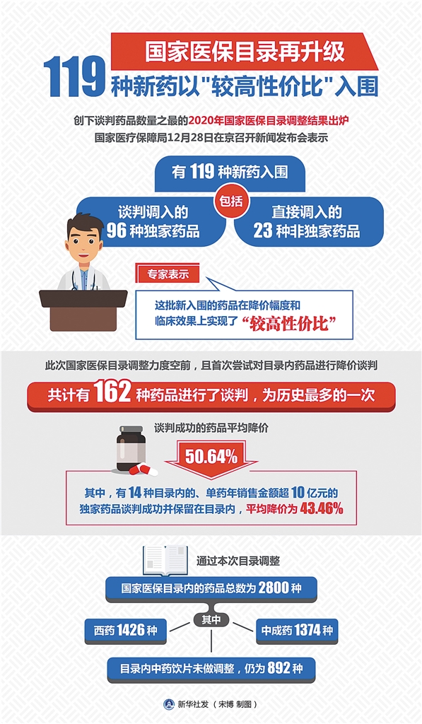 新华社北京12月28日电 (记者屈婷)创下谈判药品数量之最的2020年国家医保目录调整结果出炉。国家医疗保障局28日在京召开新闻发布会表示,有119种新药入围,包括谈判调入的96种独家药品和直接调入的23种非独家药品。专家表示,这批新入围的药品在降价幅度和临床效果上实现了“较高性价比”。