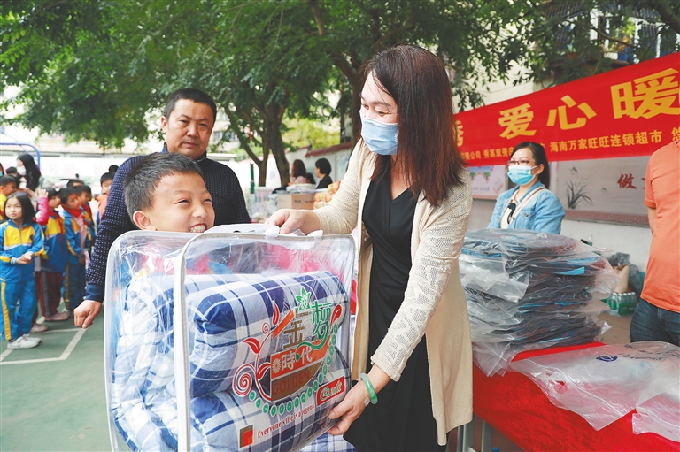 于是,一场爱心接力由此发起。“我们让校长向全校学生征集了微心愿。根据孩子们的愿望,列出了采购清单。”郑小燕介绍,有的企业捐赠了厚棉被,有的企业捐赠了厚外套、书包,还有爱心人士准备了运动鞋、袜子、毛巾、保温杯和文具……