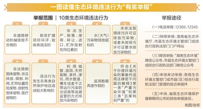 本报海口12月29日讯 (记者周晓梦 通讯员孙秀英 王伟建)有奖举报,共护环境。12月29日,海南日报记者从省生态环境厅获悉,《海南省生态环境违法行为举报奖励办法》(以下简称《办法》)自2021年1月1日起正式实施。这意味着自1月1日起,公众举报发生在海南的生态环境违法行为,一经查实并下达《行政处罚决定书》后均可获得相应的奖励。