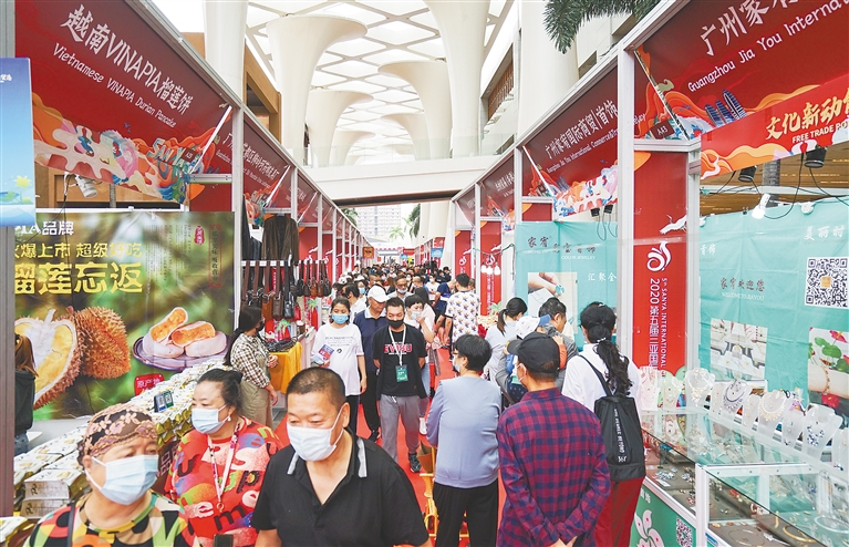 在海南自贸港展区,三亚市吉阳区、崖州区、海棠区、天涯区、育才生态区设立了独立的展馆,展示辖区内特有文化、产品及旅游资源,并同时展示黎族、苗族歌舞等文化表演,吸引市民游客驻足观看。