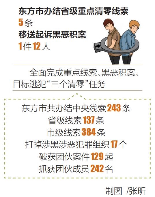 全省扫黑除恶清零攻坚战役打响后,东方市列出清单,挂图作战,共办结省级重点清零线索5条,移送起诉黑恶积案1件12人,全面完成重点线索、黑恶积案、目标逃犯“三个清零”任务。同时,东方市还自我加压,对案件线索进行认真排查,共办结中央线索243条,省级线索137条,市级线索384条,打掉涉黑涉恶犯罪组织17个,破获团伙案件129起,抓获团伙成员242名。