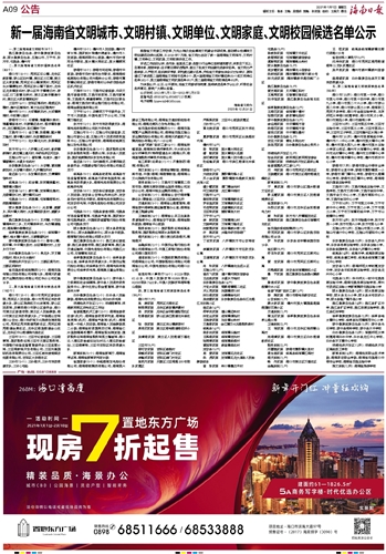 新一届海南省文明城市、文明村镇、文明单位、文明家庭、文明校园候选名单公示