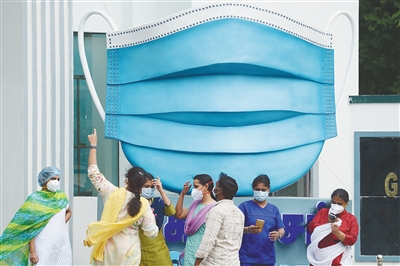 1月1日,医护人员在印度金奈的一处口罩造型雕塑旁拍照。