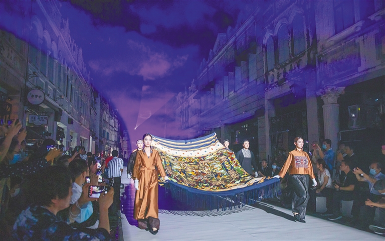 2020海南锦·绣世界文化周开幕式现场,一场沉浸式数字光影黎锦文化幻境秀在海口骑楼老街精彩上演,各式各样的黎锦服饰在“大美黎锦”服饰表演秀闪亮登场,以红、蓝、绿、黄、黑等色系上演黎锦古老与时尚的融合之美,让市民游客体验到了海南非遗在传承、创新融合中散发的全新活力。