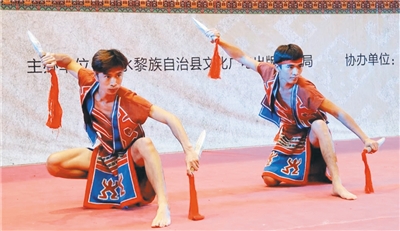 从《平安舞》《锣鼓舞》《敬祖舞》《花灯舞》中,我们可以窥见黎族以祖先崇拜和万物有灵的自然崇拜为核心的原始宗教信仰;《钱串舞》和《舂米舞》再现黎民原始劳作“刀耕火种”的情景;《钱铃双刀舞》和《打曲舞》中,舞者手持刀棍打斗,动作剧烈而又悲壮,则生动展现了黎族人民的英勇斗争史。