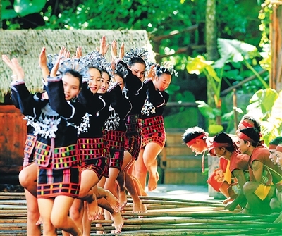 这种舞据说起源于古崖州(今三亚市)的一种黎族丧葬活动,经过创新改编后,原先的木棍、圆木改为竹竿,“女打男跳”变为“男女混合打跳”,跳时加入许多高难度动作。每当舞者灵巧地从竹竿上跳过,持竿者齐声高呼,传递出的气氛热闹而诙谐,将黎人的豪迈洒脱性格展露无疑,也难怪宋代大文学家苏轼自海南遇赦北归时,留下“蛮舞与黎歌,余音犹杳杳”的感慨。