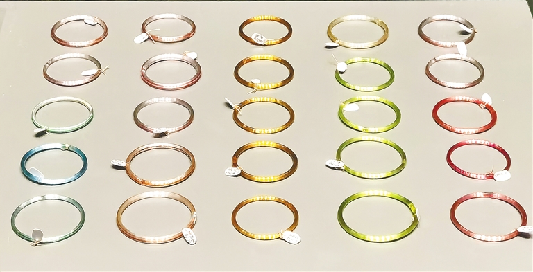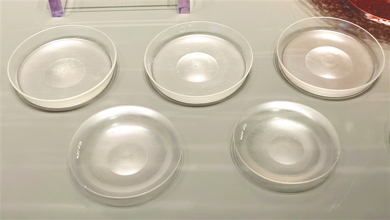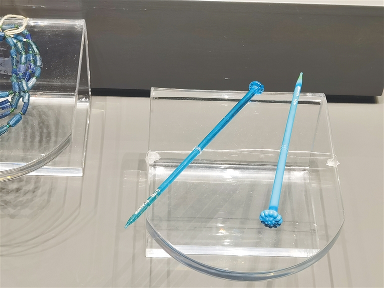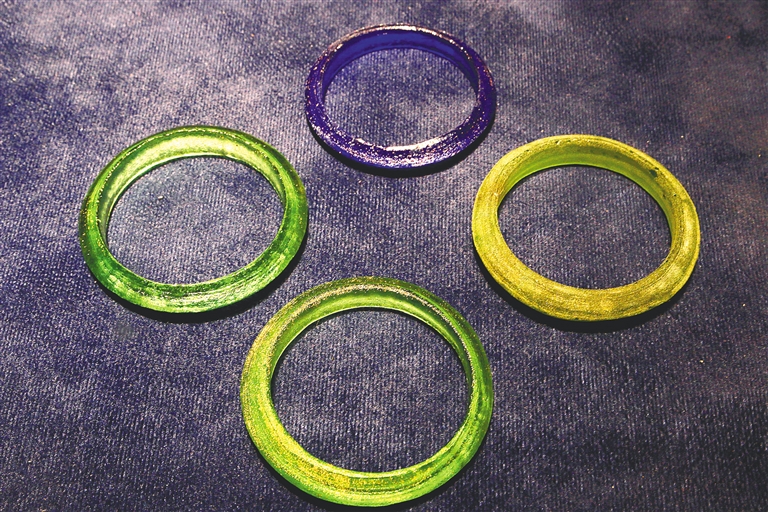 展出的玻璃器物中,主要有玻璃环、玻璃盘、玻璃杯、玻璃罐、玻璃发簪和玻璃串珠等。其中,玻璃环的式样有四种,颜色也比较丰富,有红、绿、蓝、橙等颜色。玻璃盘有直腹和弧腹两种,比较浅,都是透明的,但透明度不是很好。玻璃杯形状类似于现代的小啤酒杯,外壁有浅开瓣纹,底部饰有一圈六瓣花纹。玻璃发簪有蓝色和松石绿两种色泽,簪杆呈长针状,簪头为立体花瓣状。而条形状的玻璃串珠,每颗长度为0.5至1厘米,有透明、蓝色,松石绿等颜色。