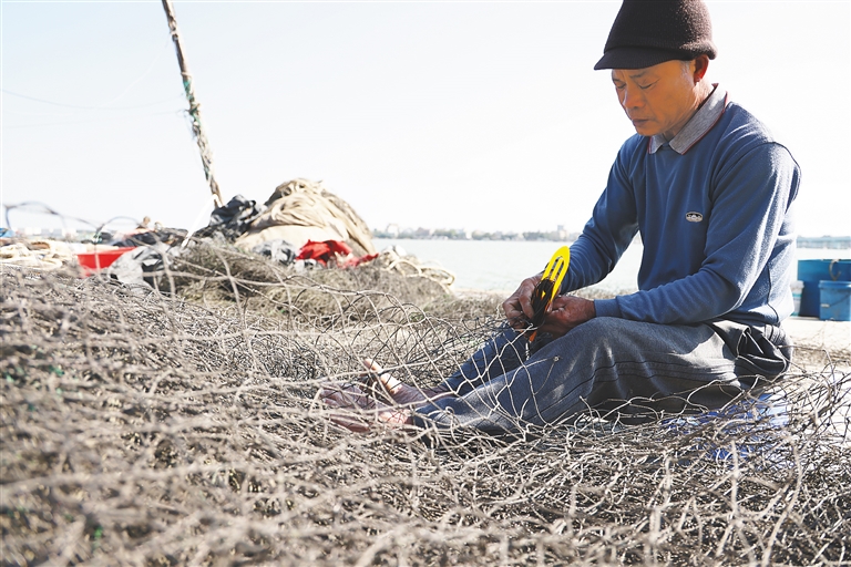沿着渔港旁边村道前行,满眼都是渔村风光。一侧是密密麻麻的渔网和白色泡沫塑料捆绑而成的浮标,另一侧则是一个接一个的渔船装卸平台,每个平台上都有水泥锚桩,木质渔船依次系上面,让整个渔港充满复古风。眼下水冷风冷,出海的渔船并不多,渔民们大部分在家中休息。这也正是渔民补网的好时候,他们搬来渔网线,三三两两坐在路边补渔网。