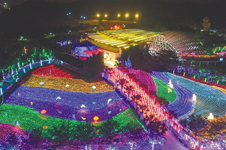 1月4日晚,航拍三亚水稻国家公园7D光影乐园。历经100天精心打造,三亚水稻国家公园7D光影乐园日前与市民游客见面。在近千亩的光影游玩体验区中,5000万颗灯珠、20万米灯线、35组大小灯组呈现出七大主题31个元素灯展,为市民游客带来一场视觉盛宴。