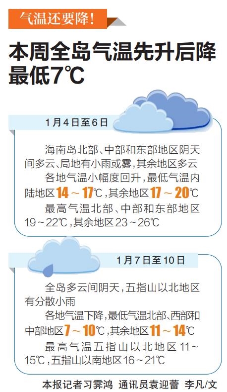 最高气温五指山以北地区11~15℃,五指山以南地区16~21℃
