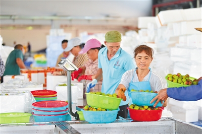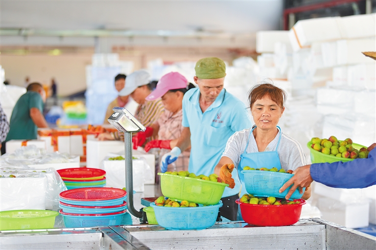 去年5月投用的湘海荔枝交易中心基地,日分拣量可达30万斤,11个交易档口可对荔枝进行预冷处理、打包装箱,让荔枝“抢鲜”上市。