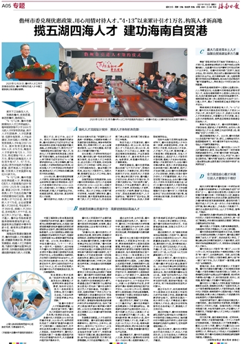 儋州市委组织部常务副部长王平说,在海南2020年面向全球招聘人才活动中,儋州通过调研摸清了全市人才“家底”,走访各家用人单位,了解企事业单位所需的高层次人才基本需求,进而有针对性地招聘高层次人才,有效弥补当地高层次人才缺口。