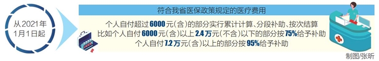 据悉,经省政府同意并由省医疗保障局、省财政厅印发的《海南省城镇从业人员大额医疗费用补助实施办法(试行)》,从2021年1月1日起实施。根据该办法,符合我省医保政策规定的医疗费用,个人自付超过6000元(含)的部分实行累计计算、分段补助、按次结算,比如个人自付6000元(含)以上2.4万元(不含)以下的部分按75%给予补助,个人自付7.2万元(含)以上的部分按95%给予补助。