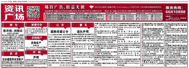 ●黄日欣(于2021年1月6月)遗失居民身份证,证号:46010320000930151X,特此声明。