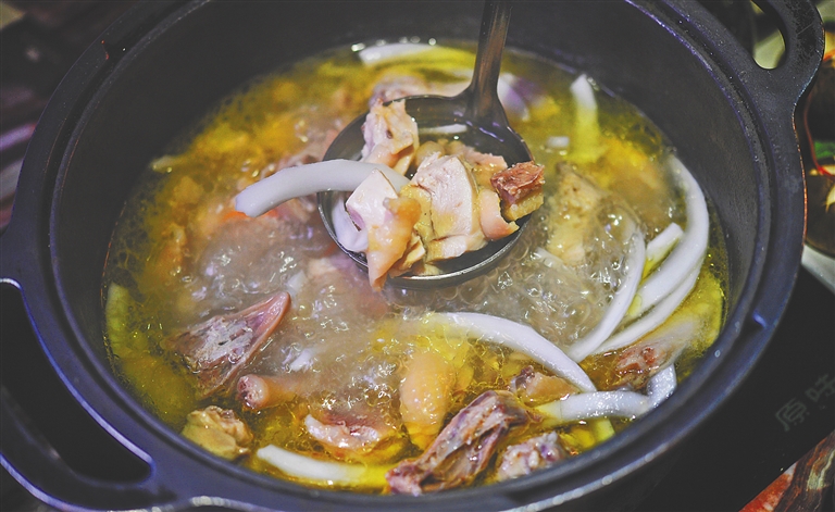 主食材吃完捞尽,清水也焖成了一锅鲜美无比的高汤。这时舀上一碗汤,再往锅中涮几筷子蔬菜,哧溜几口下肚,一身的寒气便都被驱除个精光,相当舒坦。