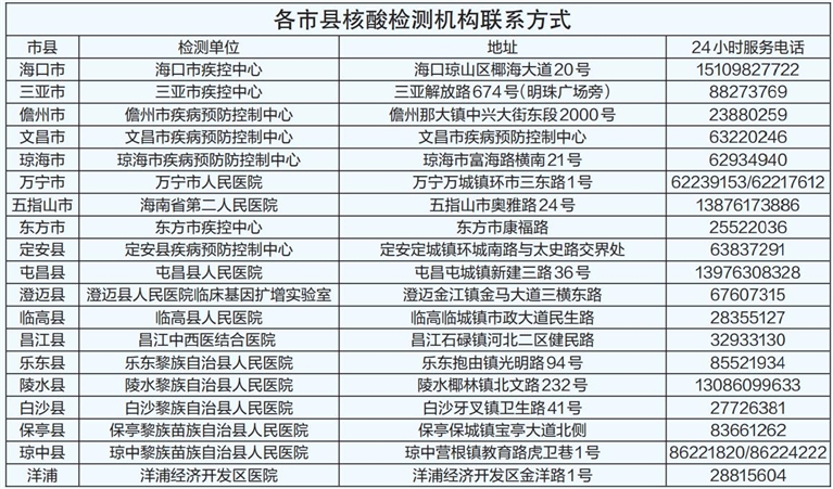 本报海口1月8日讯(记者马珂)1月8日,省疾控中心发布提示:2020年12月15日(含)以来有河北省石家庄市和邢台市旅居史,目前尚未按照要求开展核酸检测的在琼人员,请务必于1月9日18时前到就近的核酸检测机构(见附件)免费检测,并按照当地疫情防控指挥部的要求,主动配合社区、村落实管控措施,做好自我健康监测。