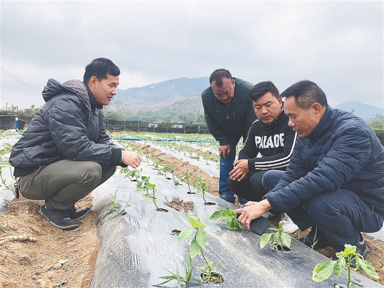 1月8日上午,昌江黎族自治县农业技术推广服务中心技术人员第一时间赶赴乌烈镇峨沟村万亩田洋瓜菜基地,认真查看辣椒种植户的种植规模、种植环境等情况。图为技术人员到种植基地指导防寒防冻工作。