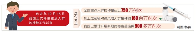 新华社北京1月9日电 (记者沐铁城 王琳琳)国家卫生健康委副主任、国务院联防联控机制科研攻关组疫苗研发专班负责人曾益新9日在国务院联防联控机制新闻发布会上表示,去年12月15日以来,我国正式开展重点人群的接种工作,迄今为止,全国重点人群接种量已近750万剂次,加上之前针对高风险人群接种的160余万剂次,我国已累计开展新冠病毒疫苗接种900多万剂次。
