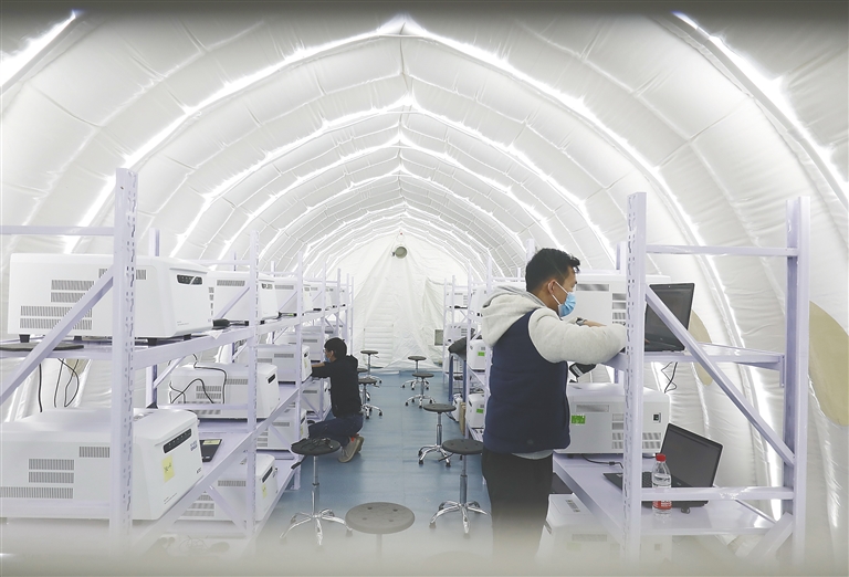 当日,日检测通量10万单管的“火眼”实验室(气膜版)经过连夜建设,在石家庄市河北体育馆网球馆亮相。目前,工作人员正在加紧安装调试设备,投入运行后每日最高可检测核酸样本量100万人份。 新华社发