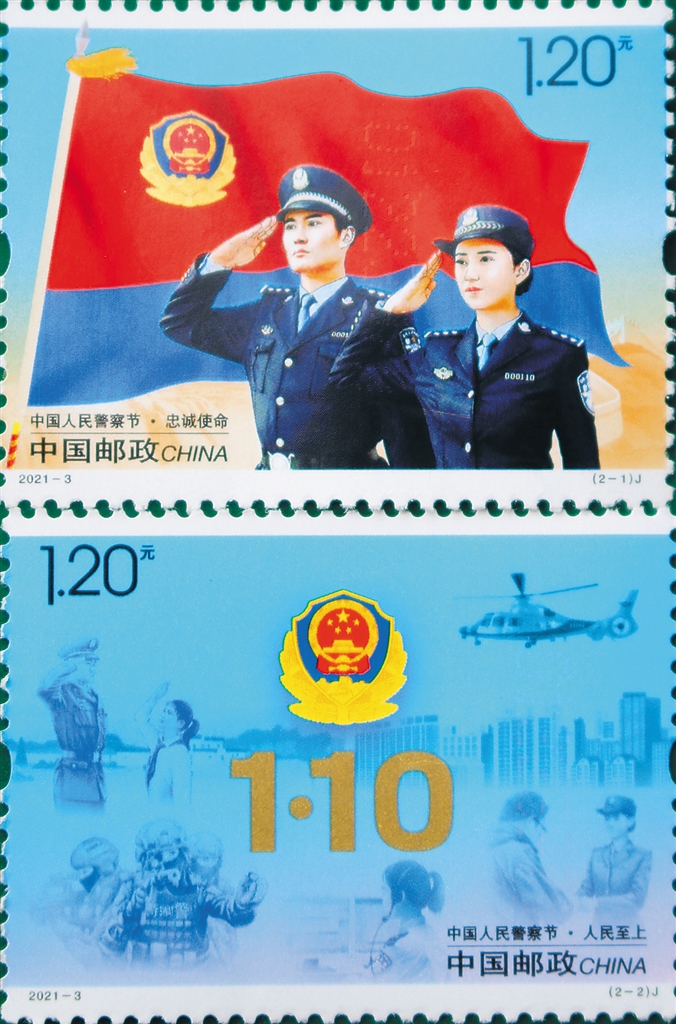 当日是首个中国人民警察节,中国邮政发行《中国人民警察节》纪念邮票一套2枚,名称分别为“忠诚使命”和“人民至上”,全套邮票面值2.40元。 新华社发
