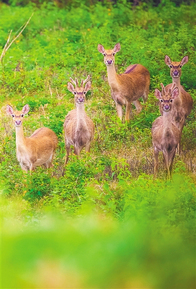 过去的几十年间,海南林业部门、科研院校和社会组织通过设立保护区、开展坡鹿生境改造与人工驯化繁育等一系列努力,帮助一个行将灭绝的物种重新恢复生机,也让“呦呦鹿鸣,食野之苹”的和谐景象重现琼岛。