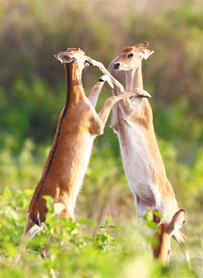 和其他鹿种相反,海南坡鹿在春夏交配,秋冬产仔。因为海南岛的秋冬季是雨季,草木繁荣,食物丰盛,只有鹿妈妈们身体健壮,鹿宝宝们才能茁壮成长,给坡鹿种群的延续带来新的希望。